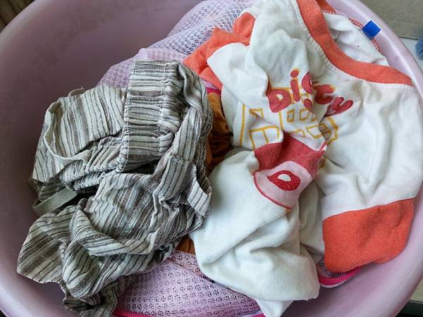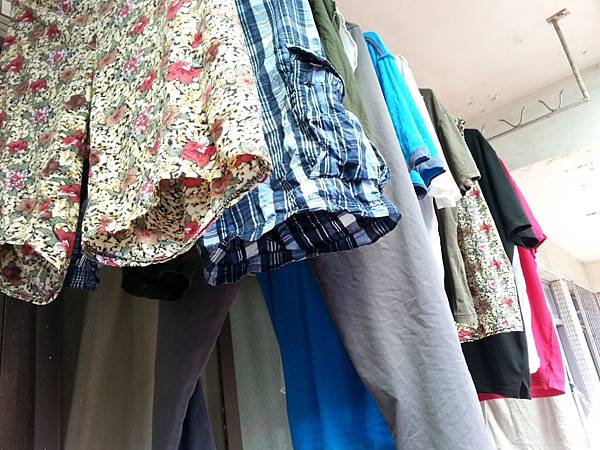我是幫哈妮洗衣服後,才知道小小孩有他個人的專屬晾衣區,說是需要用陽光消毒,大人的全部擠在一起,怎麼感覺有點心酸...