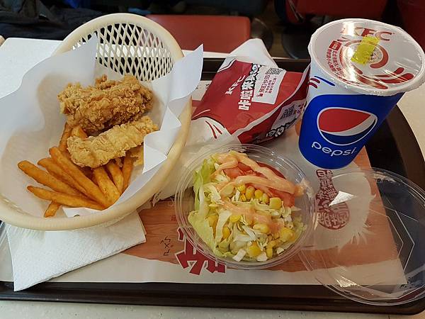 是不是覺得很豐富?左上角的雞塊及香酥脆薯不包含在內,99群星餐的樣貌,包含了一個漢堡、一份鮮蔬沙拉、一個金黃脆腿條及一杯小杯飲料,只要$111(原價99元,加價12元換購鮮蔬沙拉,雞塊及香酥脆薯是其他活動的贈品),也是非常划算滴!
