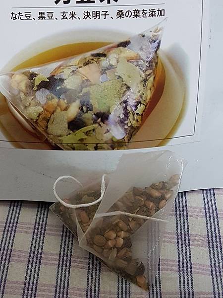 三角立體茶包本尊,是沒有圖片上這麼鮮艷啦,但目測內容物頗豐富,可以辨識出來的,像是玄米、黑豆、決明子等,可以清楚知道內容物,又知道它有通過SGS認證,喝起來多了一份安心。